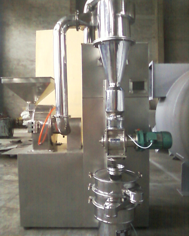 本機(jī)組有主機(jī)、輔機(jī)、集管道、電控裝置為一組,輔機(jī)有旋風(fēng)和布袋除塵器、主機(jī)內(nèi)離心分級(jí)裝置,除可完成粉碎外,還具有分級(jí)功能,分選式離心剪切,無篩無網(wǎng),粉狀顆?扇我庹{(diào)節(jié),物料粉碎后,采用負(fù)壓輸送之排料閥口,達(dá)到制品要求,該機(jī)組是制藥、食品、化工工業(yè)的理想機(jī)械。